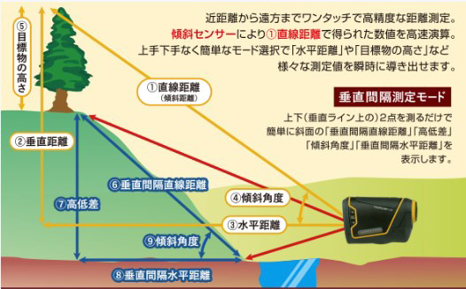 多用途で使える携帯型レーザー距離計です。直線距離だけでなく、傾斜角度・水平距離・垂直距離・高さ、2点間の垂直間隔直線距離・高低差・傾斜角度・水平距離が測定できます。