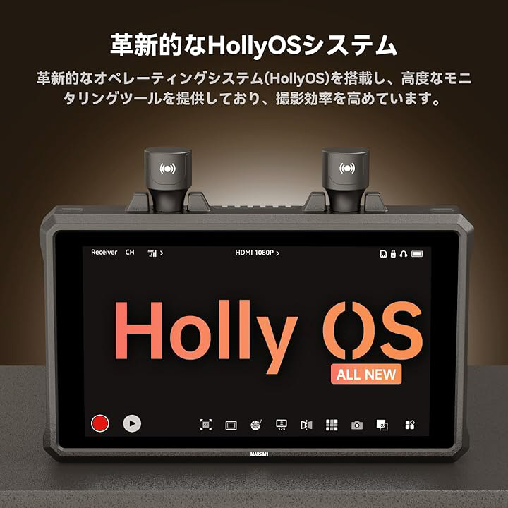 【TX、RX + モニターをオールインワン】Hollyland Mars M1 Enhancedは、送信機、受信機、モニターを一体型になるビデオモニターです。カメラモニターだけでなく、ワイヤレス映像伝送ソリューションも提供し、カメラの重量を大幅に軽減します。モニタリング画面で送信機または受信機に簡単に切り替えることができます。また、Mars 4K/300 Pro/400S Proとペアリングすることもできます。更に、「HollyView」アプリを使えば、Mars M1を送信機として最大4台のスマホ/タブレット、または2台の受信機に送信可能です。