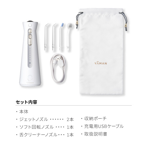 | 付属品 | ジェットノズル×2、ソフト回転ノズル×1、舌クリーナーノズル×1、充電用USBケーブル、収納ポーチ、取扱説明書 |