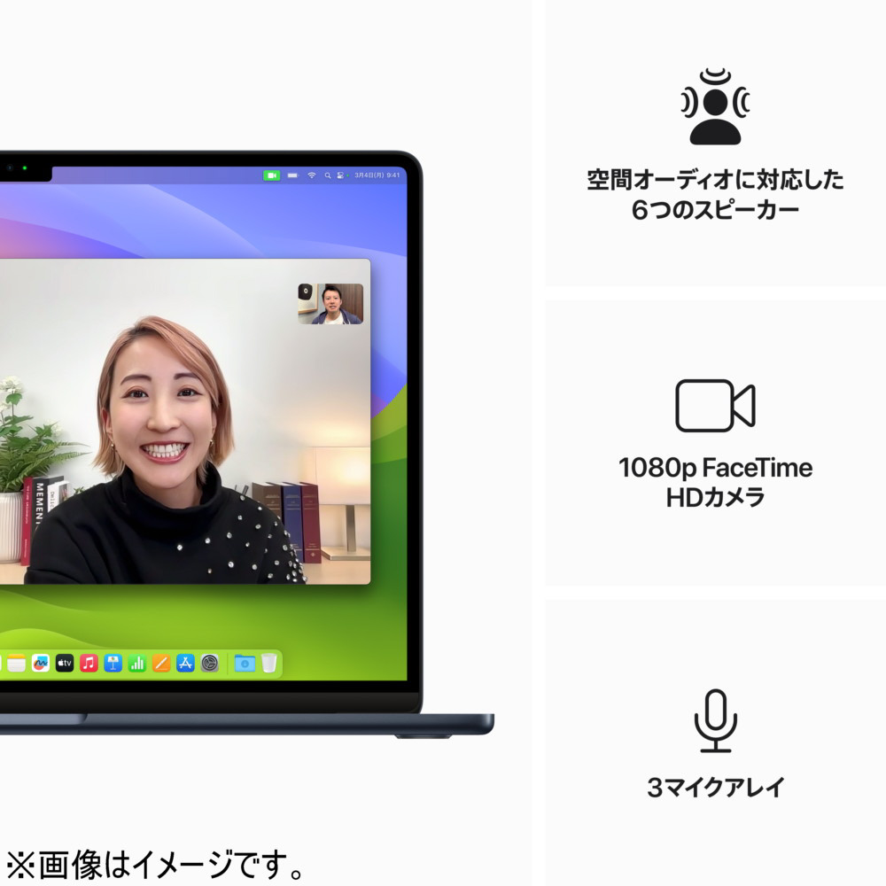 15インチMacBook Air。パワーがとまらない。M3チップにより、15インチMacBook Airが一段と優れた性能を持ちました。超ポータブルなボディなのに、最大18時間使えるバッテリーを内蔵。仕事も遊びも、好きな場所で好きなように楽しめます。