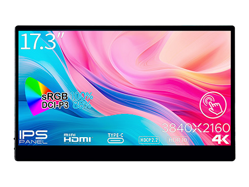 HDRに対応した17.3インチ 4K(3840x2160)解像度 タッチパネル対応のモバイルモニターです。携帯性に優れ、外出時やテレワークなど場所を選ばすディスプレイを活用できます。