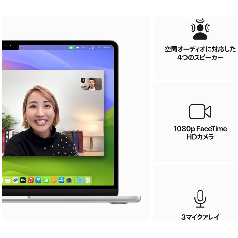 1080pFaceTimeHDカメラ、3つのマイク、空間オーディオに対応した4つのスピーカーが、美しい映像とサウンドを届けます。