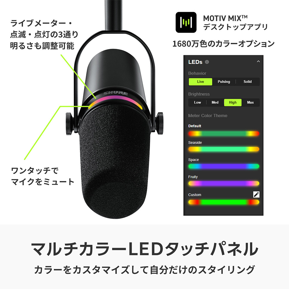 MV7+はカスタマイズ可能なLEDタッチパネル、強力なDSP機能、より上質な音声を備え生まれ変わった、音にこだわるストリーマー、ポッドキャスター、ミュージシャンのためのダイナミック型マイクロホンです。