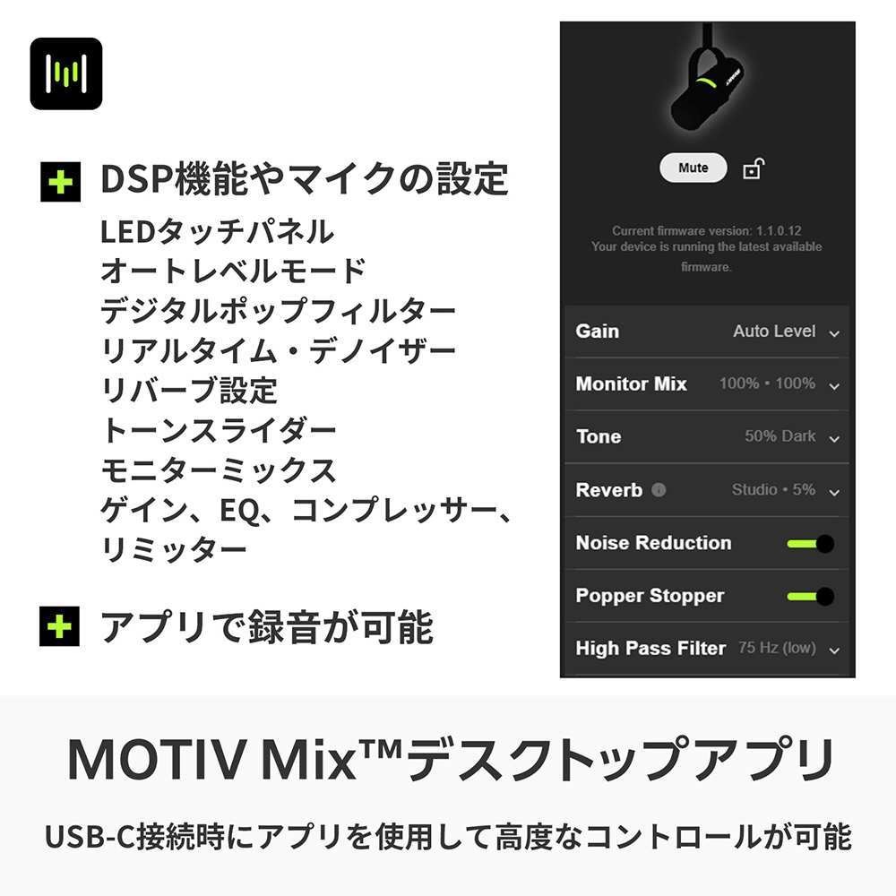 MOTIV Mixデスクトップアプリを使用すると、USB-C出力の使用時に、すべてのMV7+に内蔵された強力なDSP機能が設定可能になります。