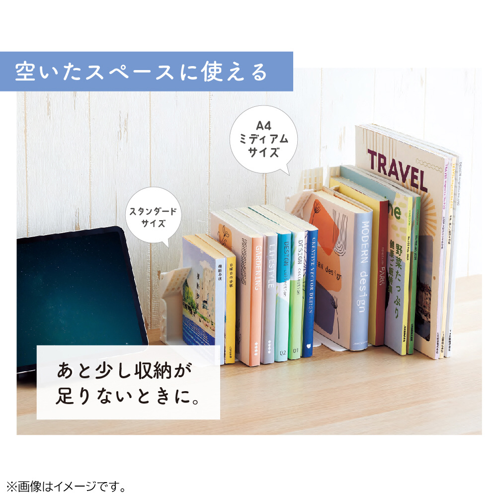 本を抜き取っても隣の本が倒れない!新しい形のブックスタンドに新サイズが登場!