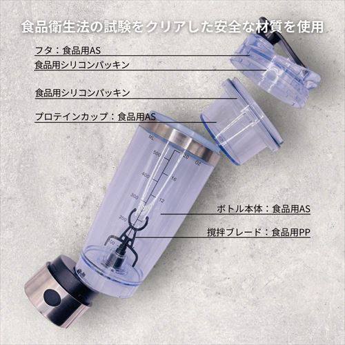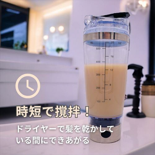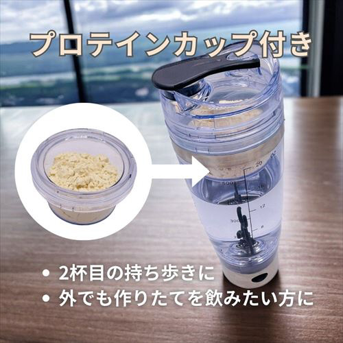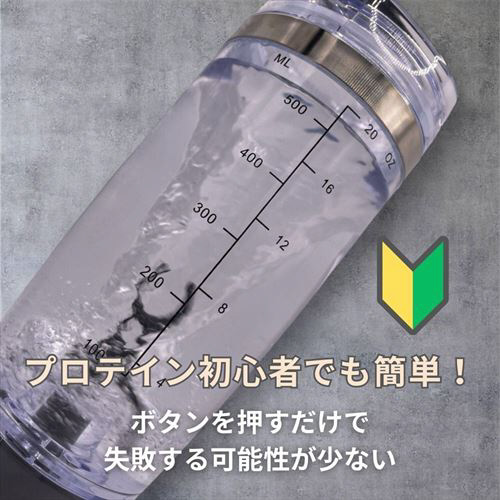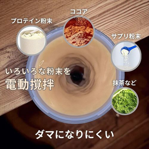 ※時間が経つと固まってしまうことがあります。その場合は、手動で上下に振ってから撹拌をスタートすることで、ある程度滑らかにプロテインが混ざります。