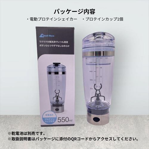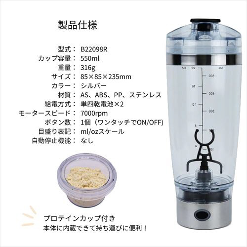 | 商品名 | 電動プロテインシェイカー 550ml 乾電池式 ステンレスタイプ シルバー DP-B22098R/SV |