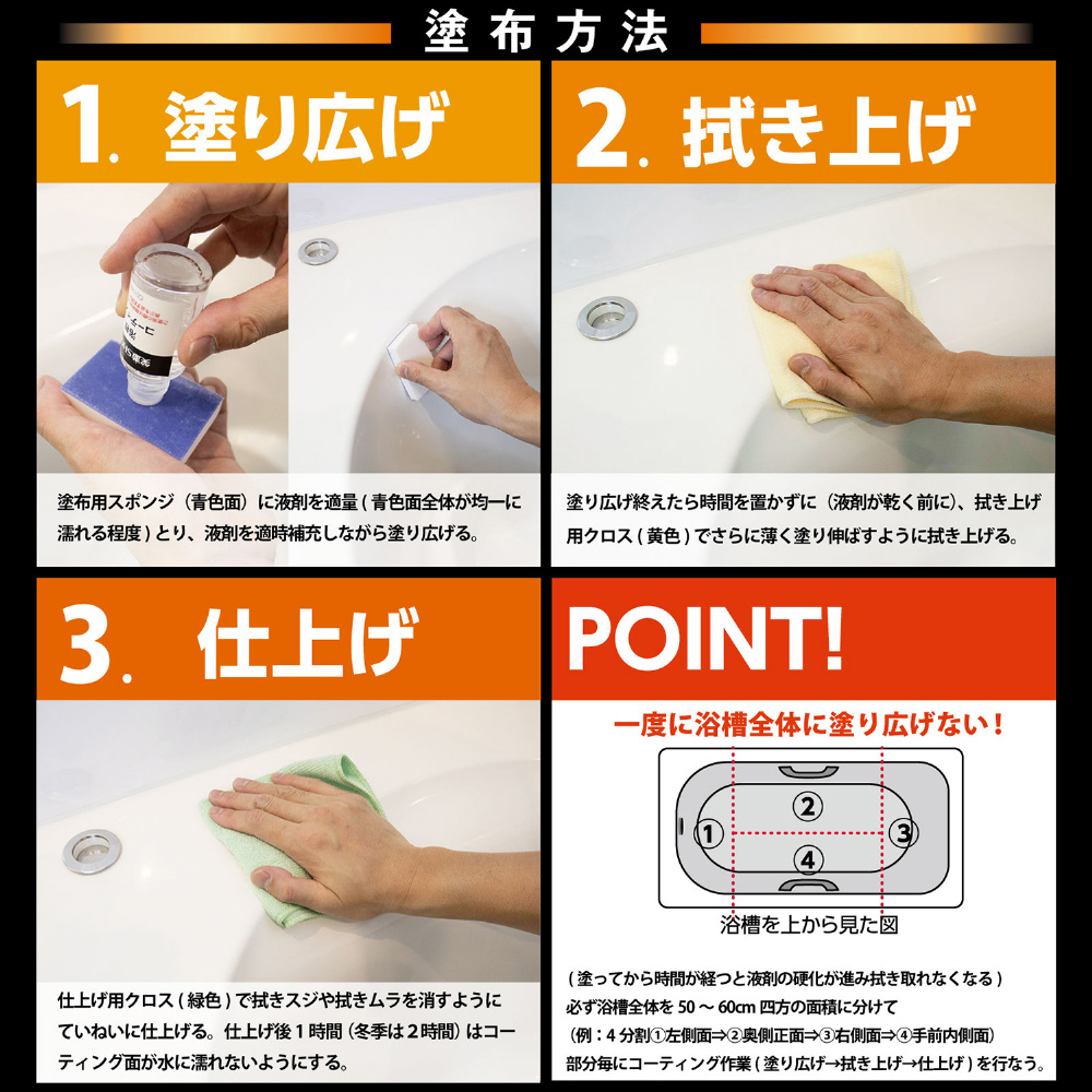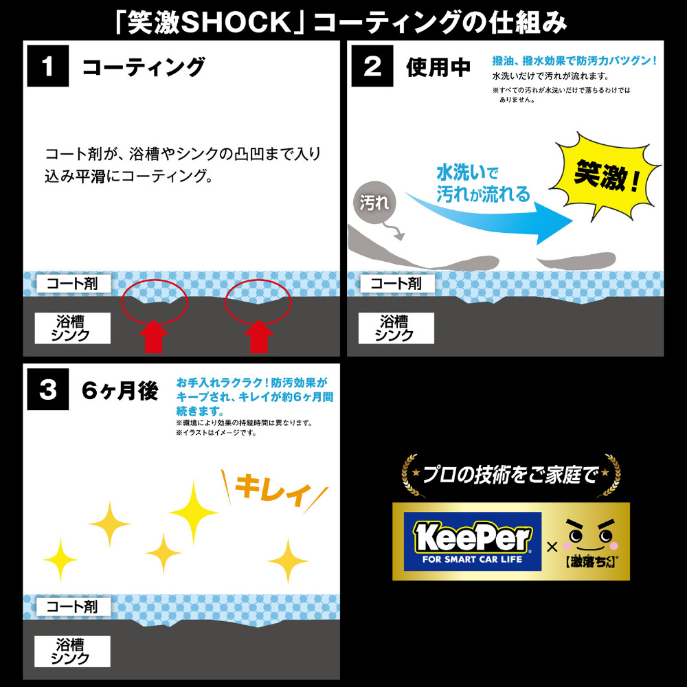 カーコーティング業界最大手のKeeper技研株式会社のノウハウを取り入れ開発した浴槽用のコーティング剤。撥油・撥水効果で水洗いで汚れを落とせます。お手入れラクラク、約6ヶ月間キレイが持続。