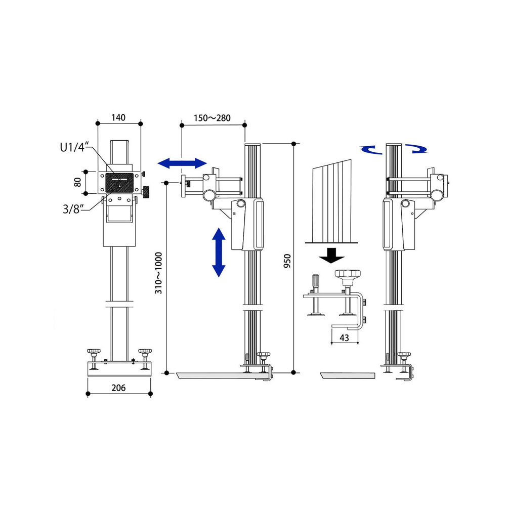 ■取付けはクランプ方式を採用,ベースボードやテーブルに固定でき,また支柱部を回転させ取付けることで,床等を利用して大サイズの被写体を撮影できます。