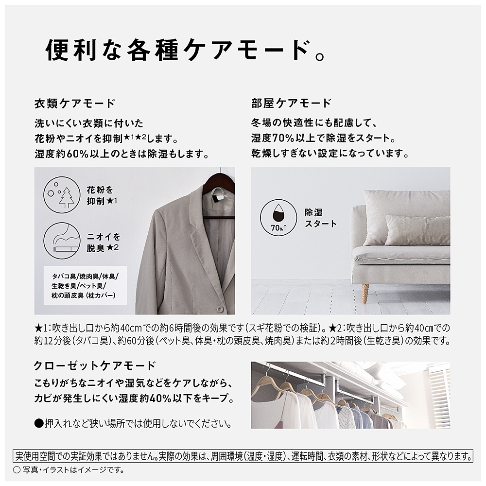 ※4:【試験機関】(一財)北里環境科学センター【試験方法】6畳の実験室において、吹出口から40cmの位置で、布に付着させた菌数を測定【除菌の方法】ナノイー放出と衣類乾燥運転(衣類乾燥・音ひかえめモード)【対象】布に付着させた菌【試験結果】7時間で99%以上抑制 北生発21_0290_2号。