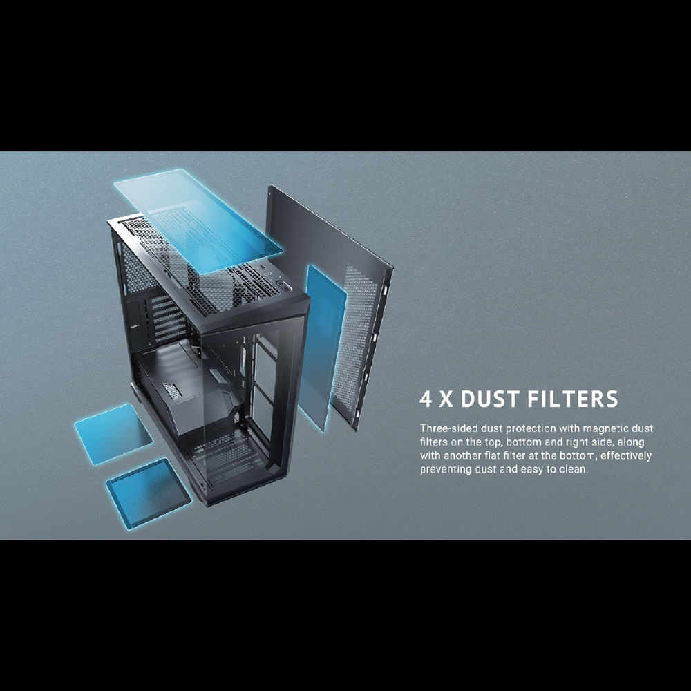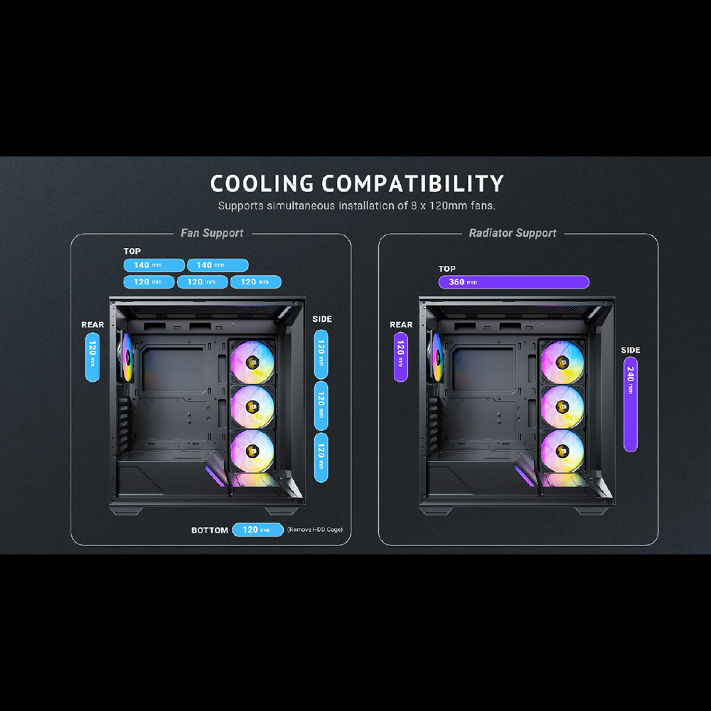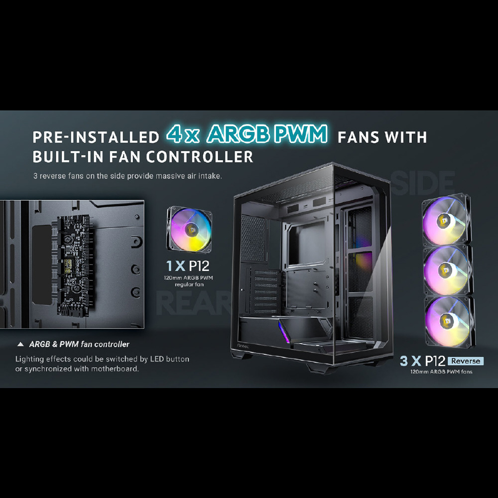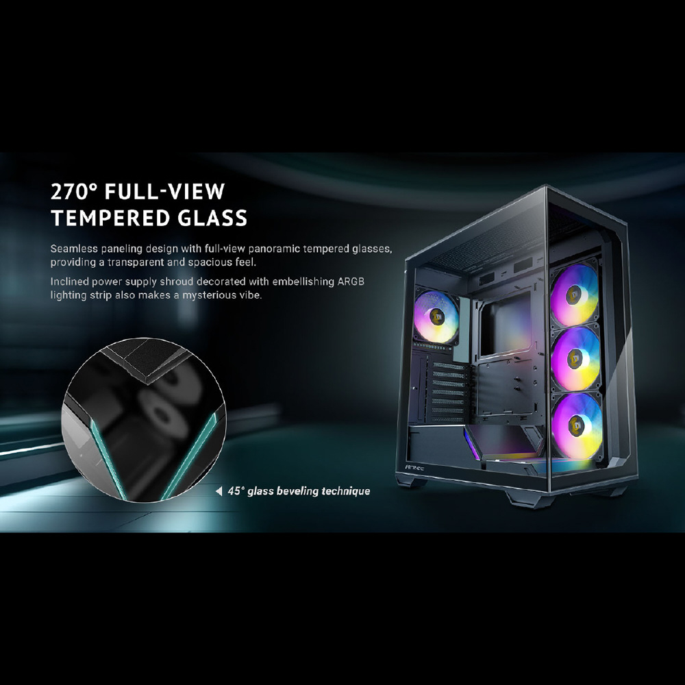Constellation C3 ARGBは、フロントとサイドに強化ガラスパネルを搭載したミドルタワーPCケースです。最大120 mmファンを8基搭載することができ、左側の強化ガラスパネルは表面にネジ穴を設けないことで美観と耐久性を両立します。