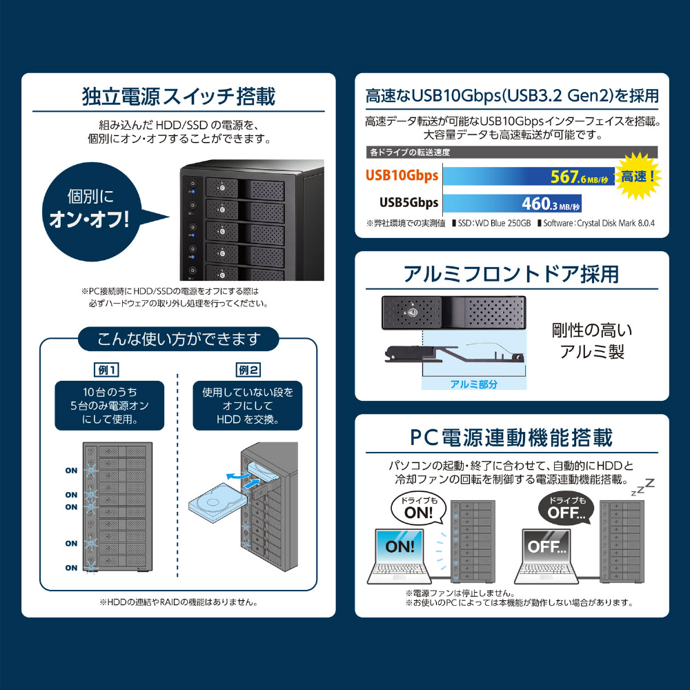3.5インチSATA HDDを最大10台まで搭載可能、高速転送USB10Gbps接続に対応したHDDケース