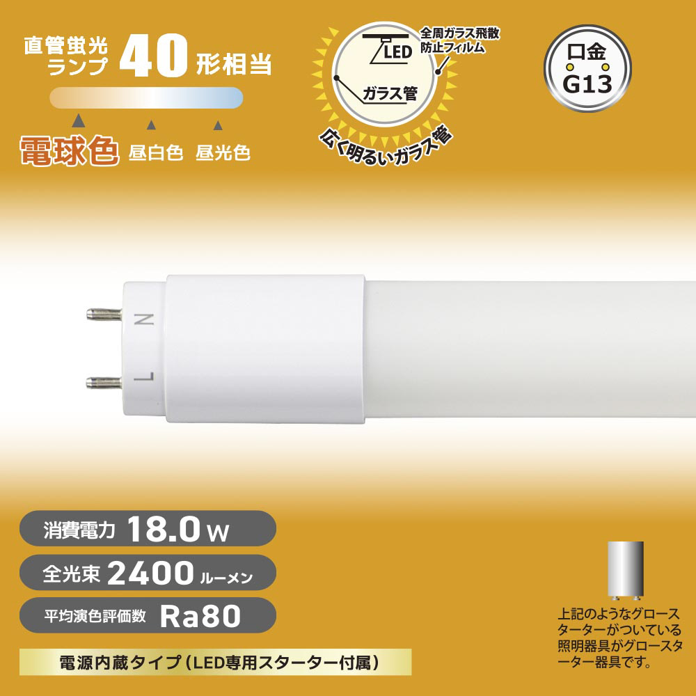 | 商品名 | 直管LEDランプ40形相当G13電球色グロースターター器具専用片側給電仕様 LDF40SSL18/247 [G13] |