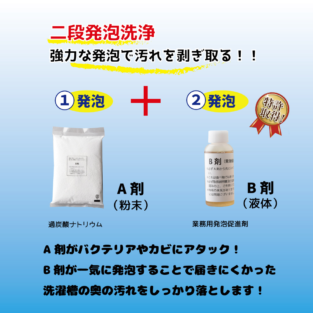 A剤の「高濃度酸素」がカビやバクテリアにアタック、そしてB剤の「発泡促進剤」が一気に発泡することによって届きにくかった奥の汚れをしっかり落とします。(特許取得 第6562417号)