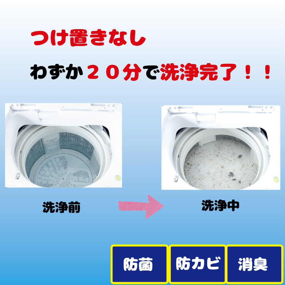 そして、驚きのスピード洗浄。つけ置きなしのわずか20分で洗浄が完了します。水にサッと溶け発泡することで洗浄時間を大幅に短縮。