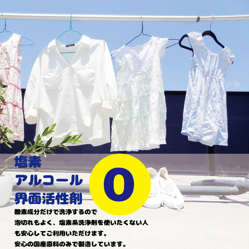 塩素・アルコール・界面活性剤は一切使用せず、酸素成分(過炭酸ナトリウム・発泡促進剤)だけで洗浄するので泡切れもよく、