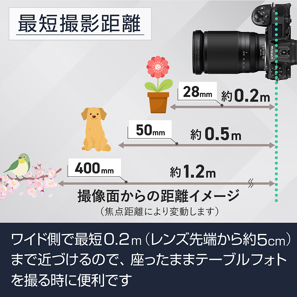 | 最短撮影距離 | ・焦点距離28mm時:撮像面から0.2m・焦点距離35mm時:撮像面から0.36m・焦点距離50mm時:撮像面から0.5m・焦点距離70mm時:撮像面から0.57m・焦点距離105mm時:撮像面から0.6m・焦点距離200mm時:撮像面から0.8m・焦点距離300mm時:撮像面から1.2m・焦点距離400mm時:撮像面から1.2m |