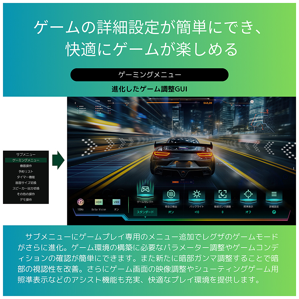 地デジやBS・CS放送はもちろん4K放送やネット動画も、大画面で視聴しても高精細でなめらかに自然な高画質で楽しめる、進化した新エンジン。高速レスポンス、進化したノイズリダクション、快適な操作性を備えました。さらに、ネット動画で発生する圧縮ノイズやバンディングを抑制することで、大画面で視聴してもなめらかで自然な高画質を実現します。