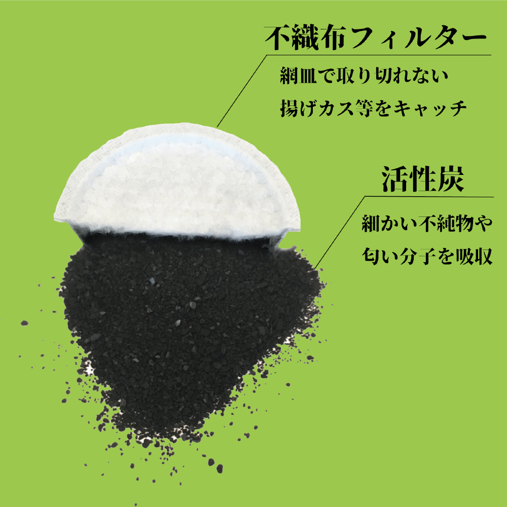 不織布フィルターが網皿で取り切れない揚げカス等をキャッチし、活性炭フィルターが細かい不純物や匂い分子を強力吸収します。