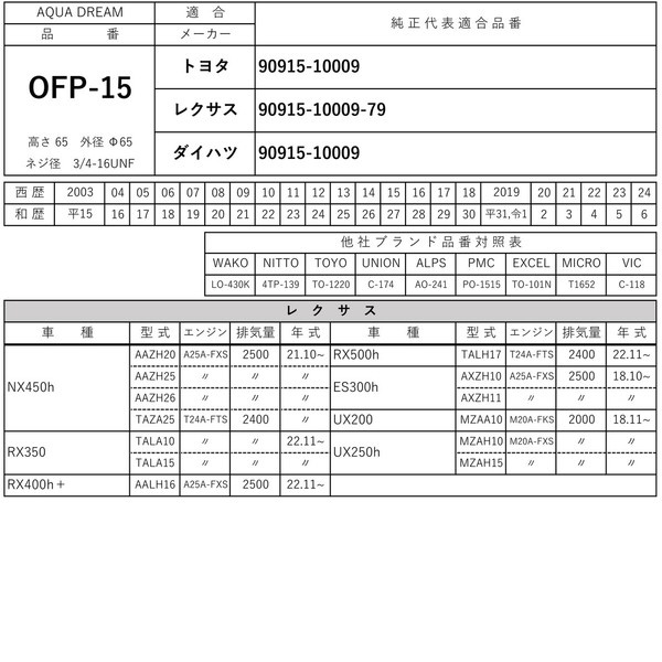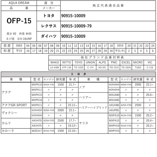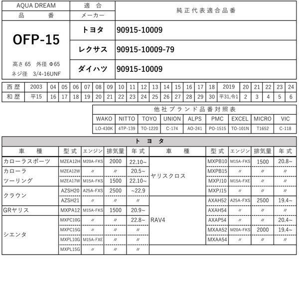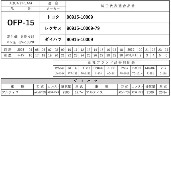 | 商品名 | PLATINUM オイルフィルター トヨタ・レクサス・ダイハツ車用(代表純正品番:90915-10009等) AD-OFP-15 【864】 |