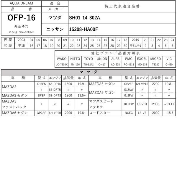 | 商品名 | PLATINUM オイルフィルター マツダ・ニッサン車用(代表純正品番:SH01-14-302A等) AD-OFP-16 |