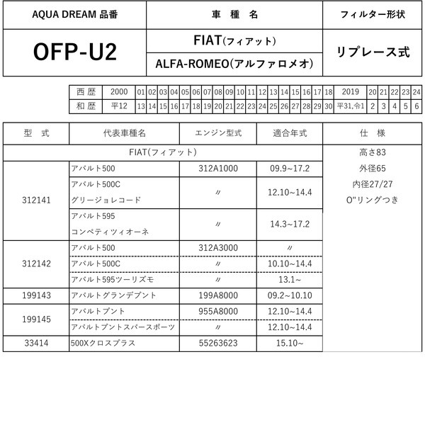 | 商品名 | U2 PLATINUM オイルフィルター FIAT(フィアット)・ALFA-ROMEO(アルファロメオ)車用 リプレース式 AD-OFP-U2 |