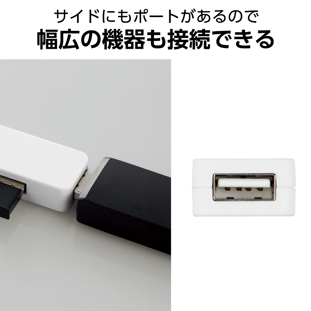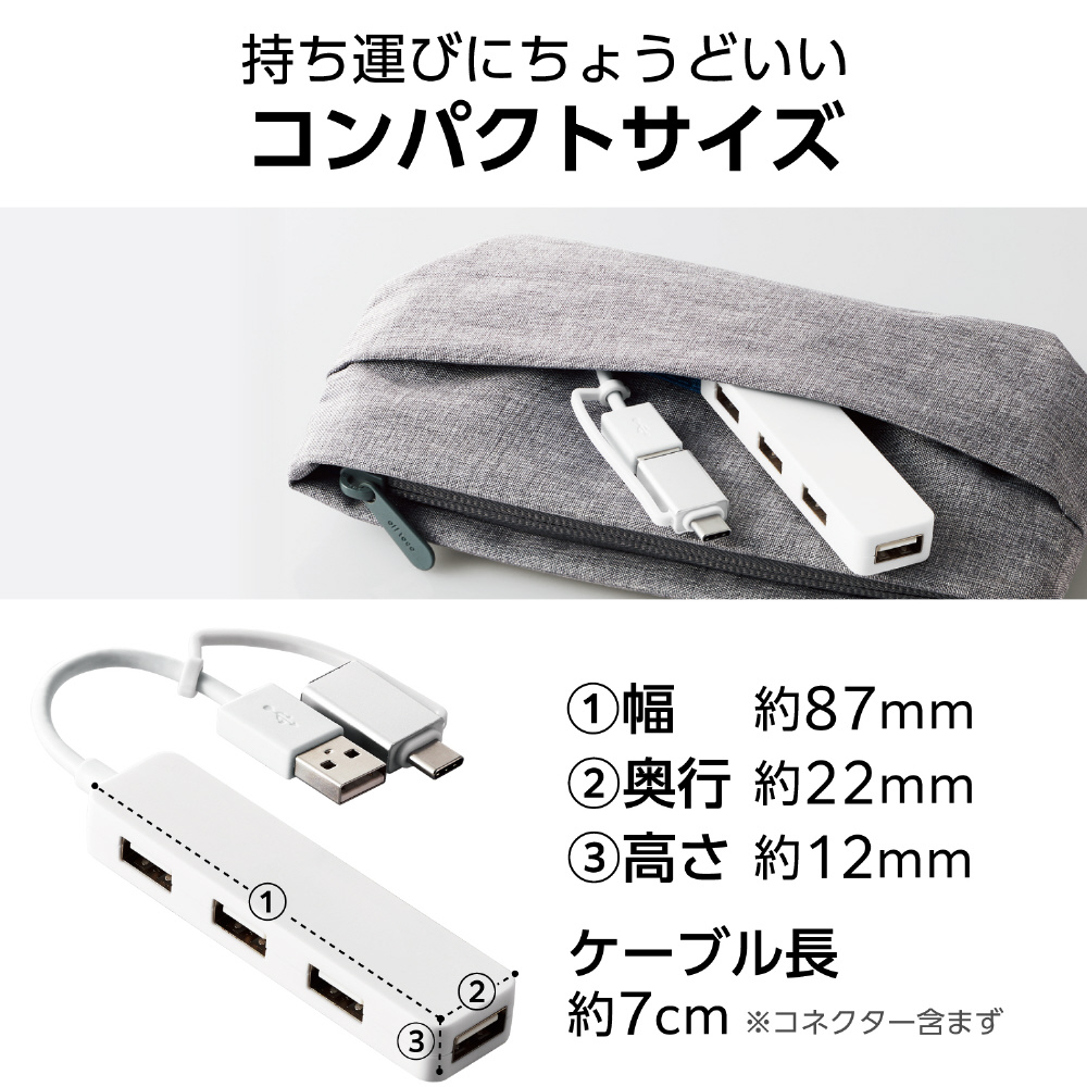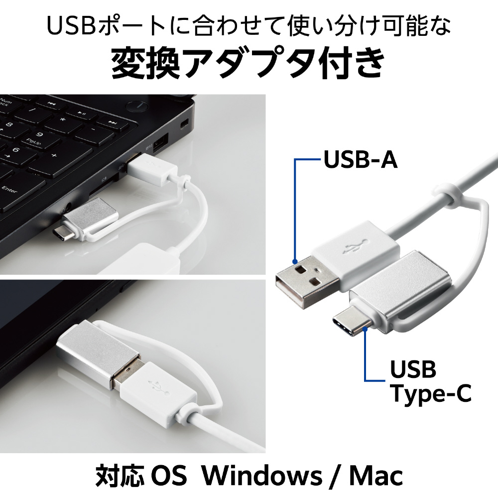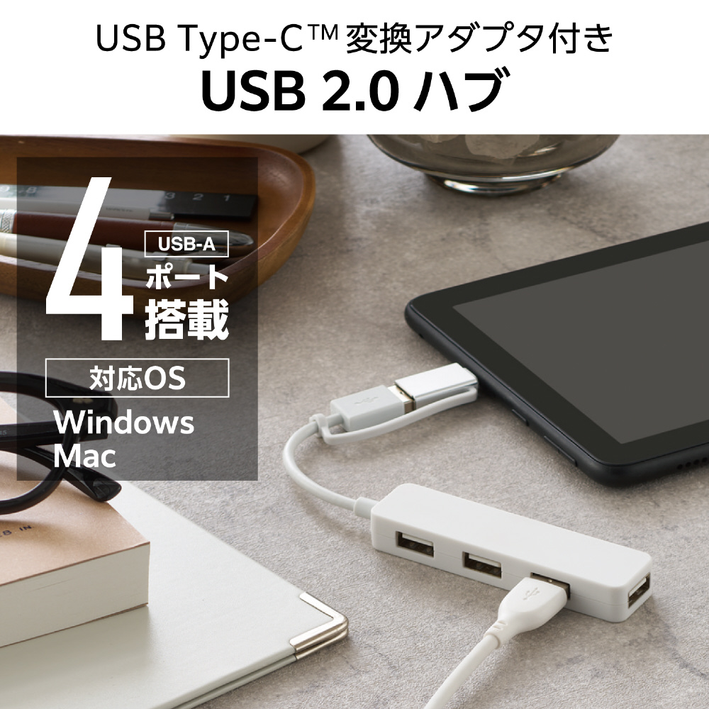 USB-AポートにもUSB Type-C(TM)ポートにも接続できる、変換アダプター付きUSB2.0ハブです。コネクター部分を変えられるため、パソコンとタブレットの両方で使いたい場合にも、これ一つで手軽に兼用できます。便利な4ポートタイプです。
