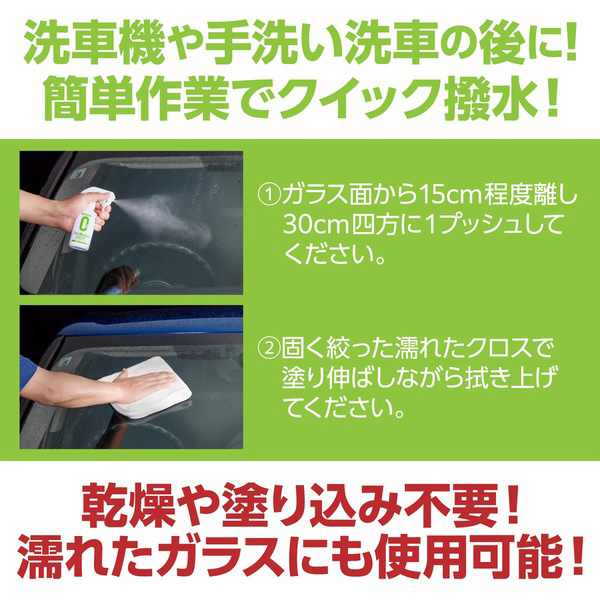 スプレーして拭くだけ、クイック作業でスパッと水滴を飛ばして視界を確保!洗車機や手洗い洗車の後におすすめ!