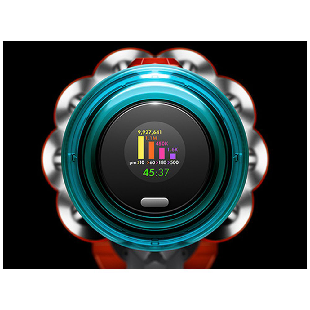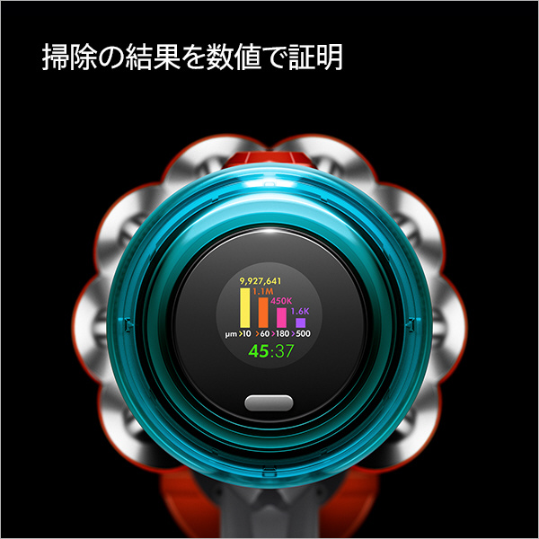 吸引したゴミを計測、サイズごとに分類し、その結果を液晶ディスプレイにリアルタイムに表示します(*2)。また、現在の吸引モードや秒単位の残りの運転時間を表示し、効率的な掃除を可能にします。