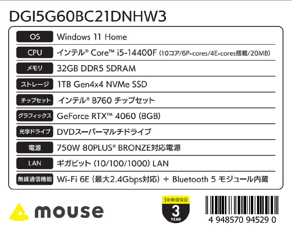 DGI5G60BC21DNHW3 ゲーミングデスクトップパソコン G-Tune(RTX 4060) ホワイト [モニター無し /Windows11 Home /intel Core i5 /メモリ:32GB /SSD:1TB /無し]