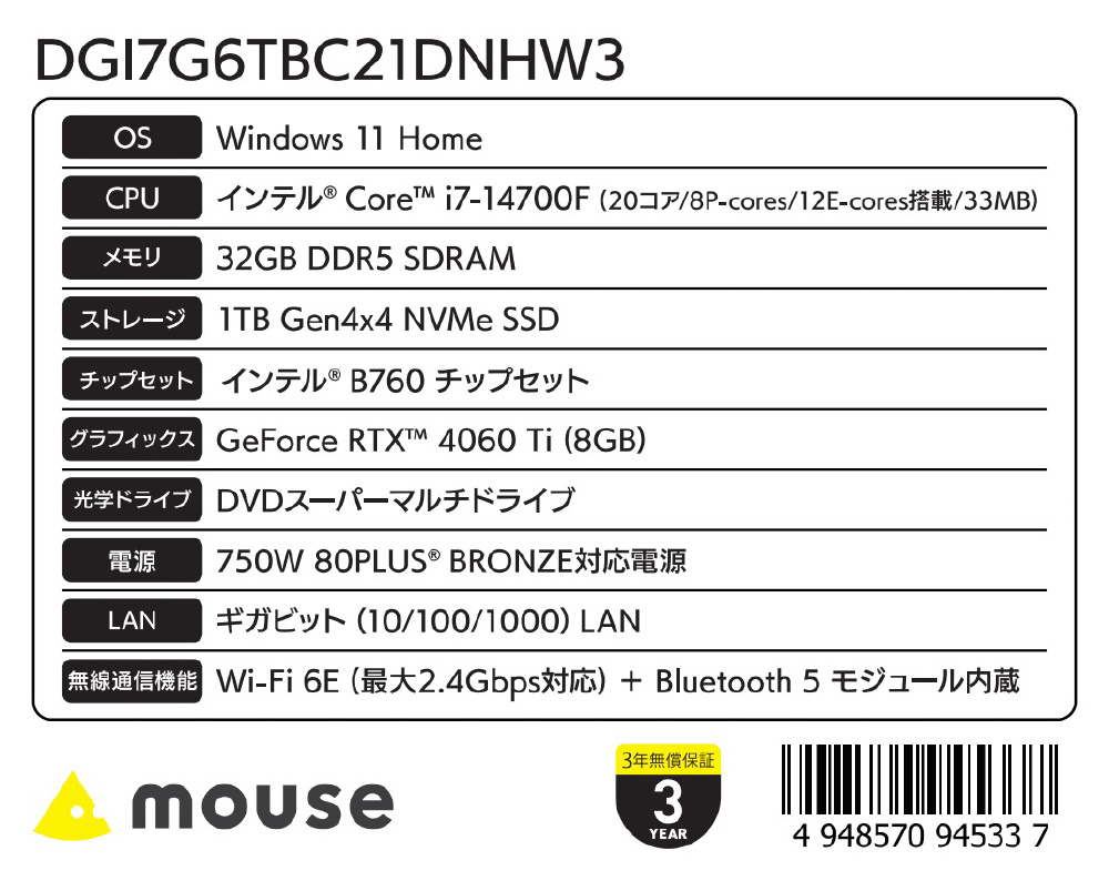 DGI7G6TBC21DNHW3 ゲーミングデスクトップパソコン G-Tune(RTX 4060 Ti) ホワイト [モニター無し /Windows11 Home /intel Core i7 /メモリ:32GB /SSD:1TB /無し]