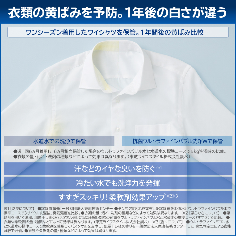 抗菌ウルトラファインバブル洗浄Wで繊維の奥から汚れを落として、黄ばみを防ぐ。