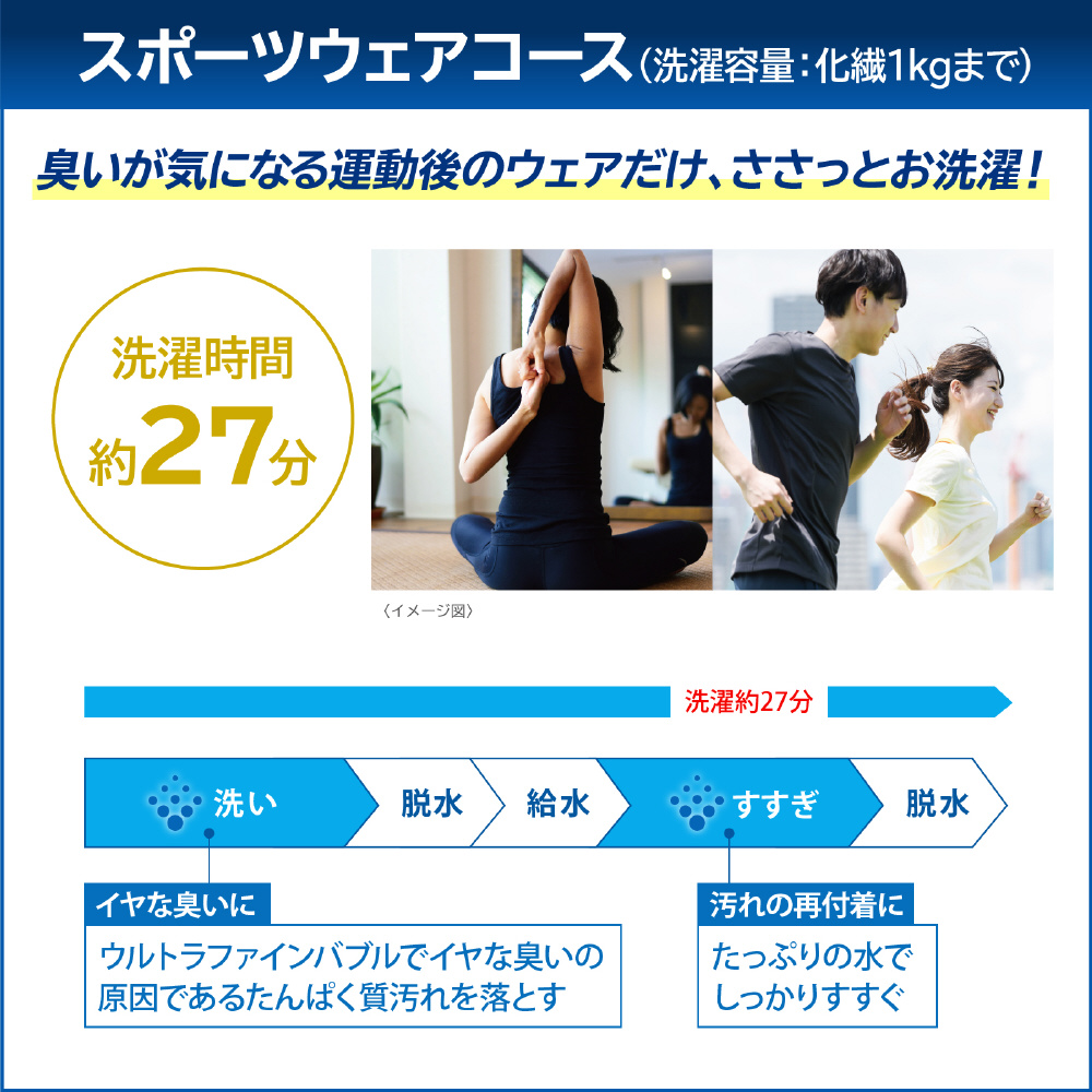 | コース | メモリー(12kg)、スピード(5kg)、つけおき(6kg)、自動2度洗い(3kg)、毛布(6kg)、部屋干し(5kg)、おしゃれ着(3kg)、香るおしゃれ着(3kg)、スポーツウェア(化繊1kg) |