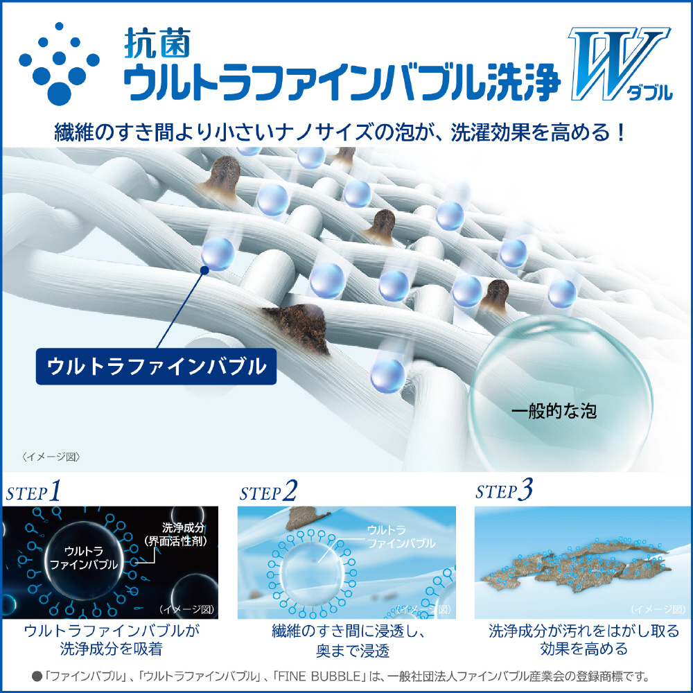 抗菌ウルトラファインバブル洗浄Wで繊維の奥から汚れを落として、黄ばみを防ぐ。