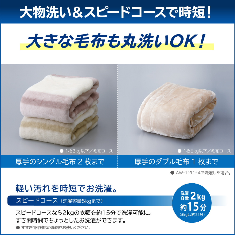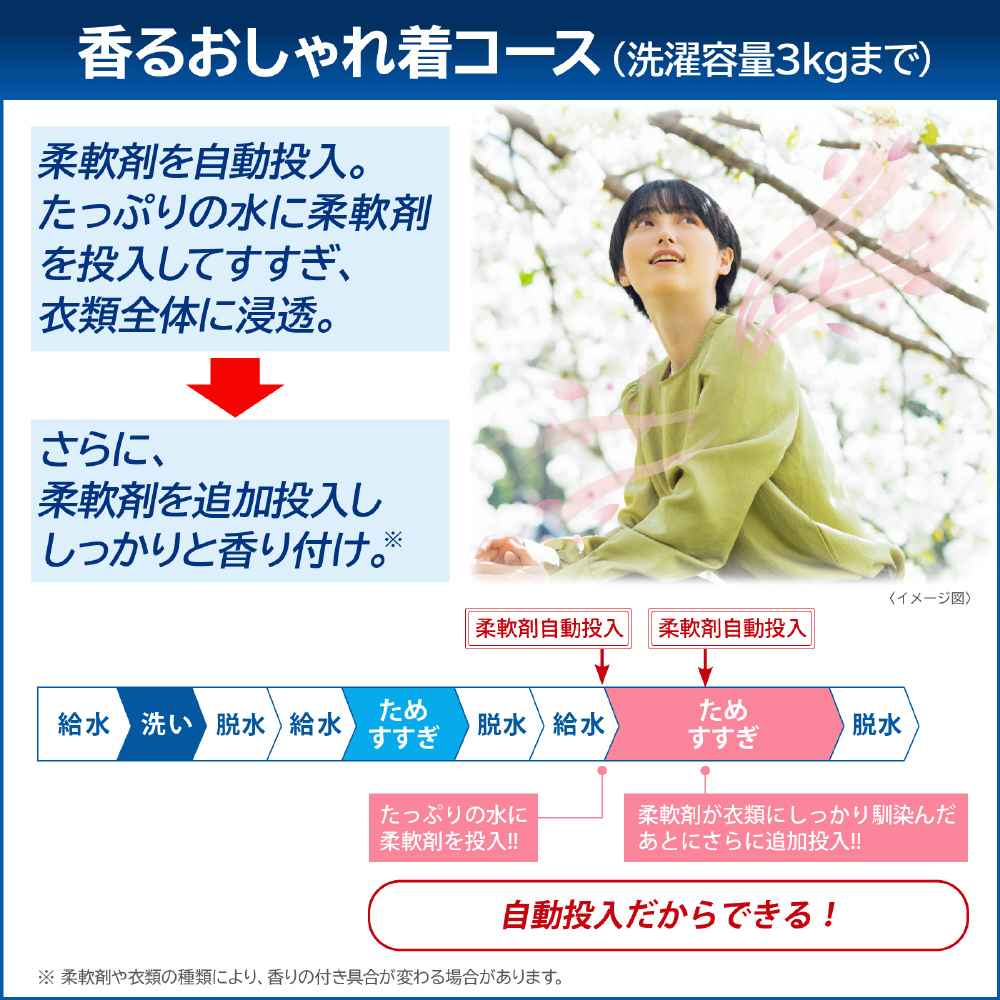 | コース | メモリー(10kg)、スピード(5kg)、つけおき(6kg)、自動2度洗い(3kg)、毛布(4.7kg)、部屋干し(5kg)、おしゃれ着(3kg)、香るおしゃれ着(3kg)、スポーツウェア(化繊1kg) |