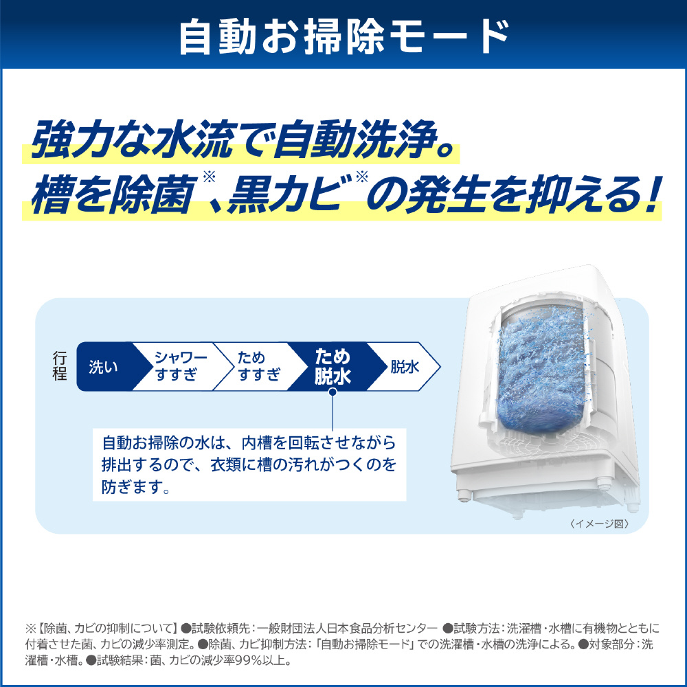 ●試験依頼先:一般財団法人日本食品分析センター●試験方法:洗濯槽・水槽に有機物と共に付着させた菌、カビの減少率測定。●除菌、 カビ抑制方法:「自動お掃除」モードでの洗濯槽・水槽の洗浄による。●対象部分:洗濯槽・水槽。●試験結果:菌、カビの減少率99%以上。