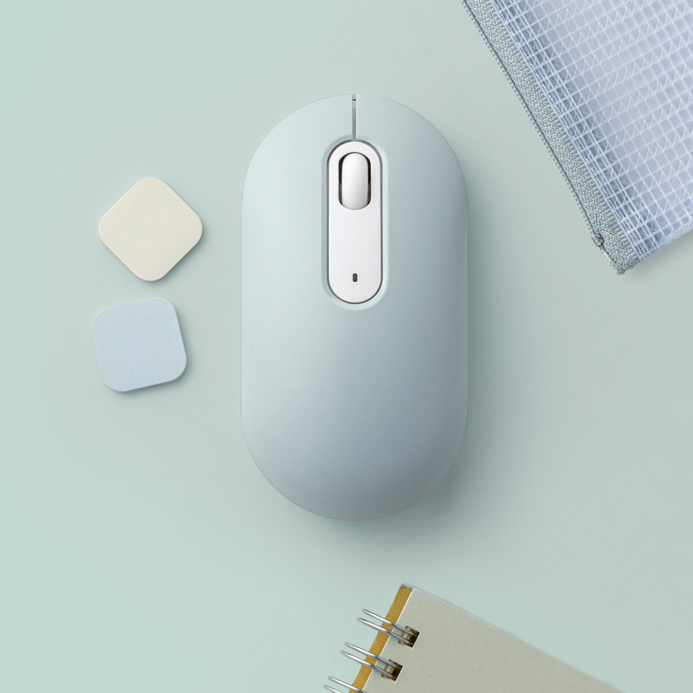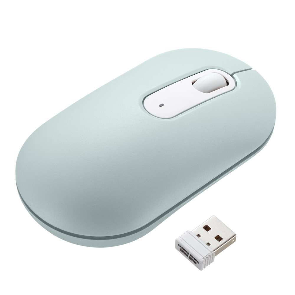 厚さ約30mmの薄型設計で、持ち運びしやすいワイヤレスマウス。レシーバーは上ケースの中に収納可能。