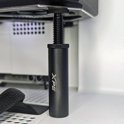 XPGのロゴが刻印されたVGAサポートステイです。大型ファンを搭載し重量のあるグラフィックカードを支え、マザーボードやグラフィックカードにかかる負荷を軽減します。