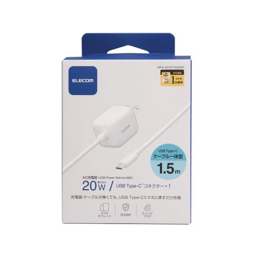 ケーブル一体型で、USB Type-C(TM)ポート搭載のスマートフォン、タブレットなどをすぐに充電できるUSB AC充電器です。ケーブルの長さは約1.5mで、取り回しがしやすいです。