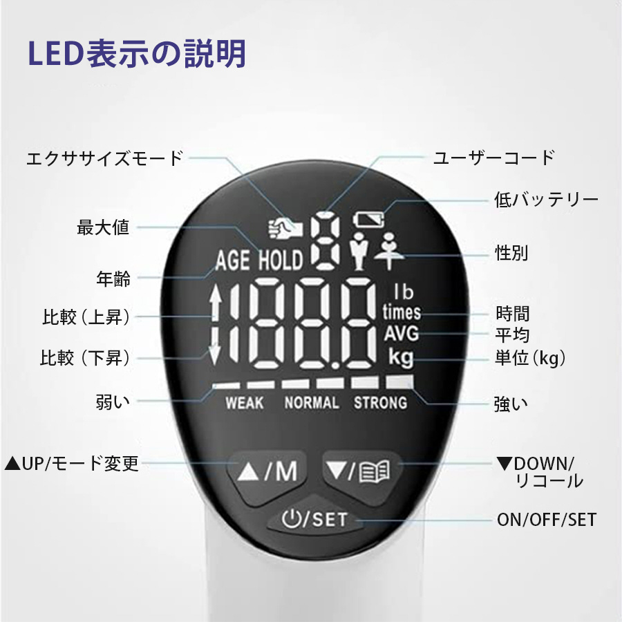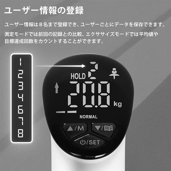 ユーザーコード、性別、年齢、単位、目標強度値などのユーザー情報を最大8名まで登録できます。