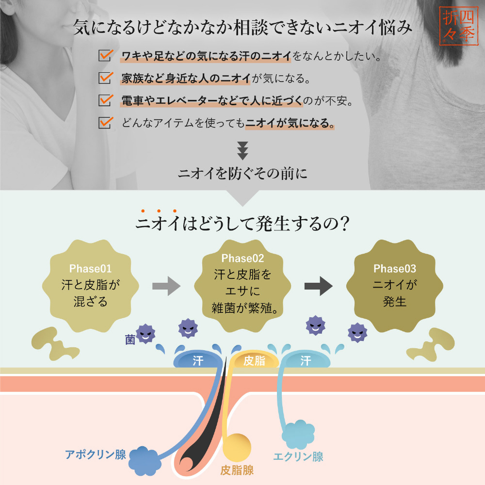ニオイの元を殺菌・消毒。体臭、汗臭を防ぐ。
