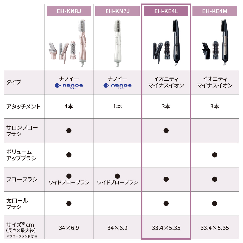 | 本体サイズ | 長さ334×最大径53.5mm(ブローブラシ装着時) |