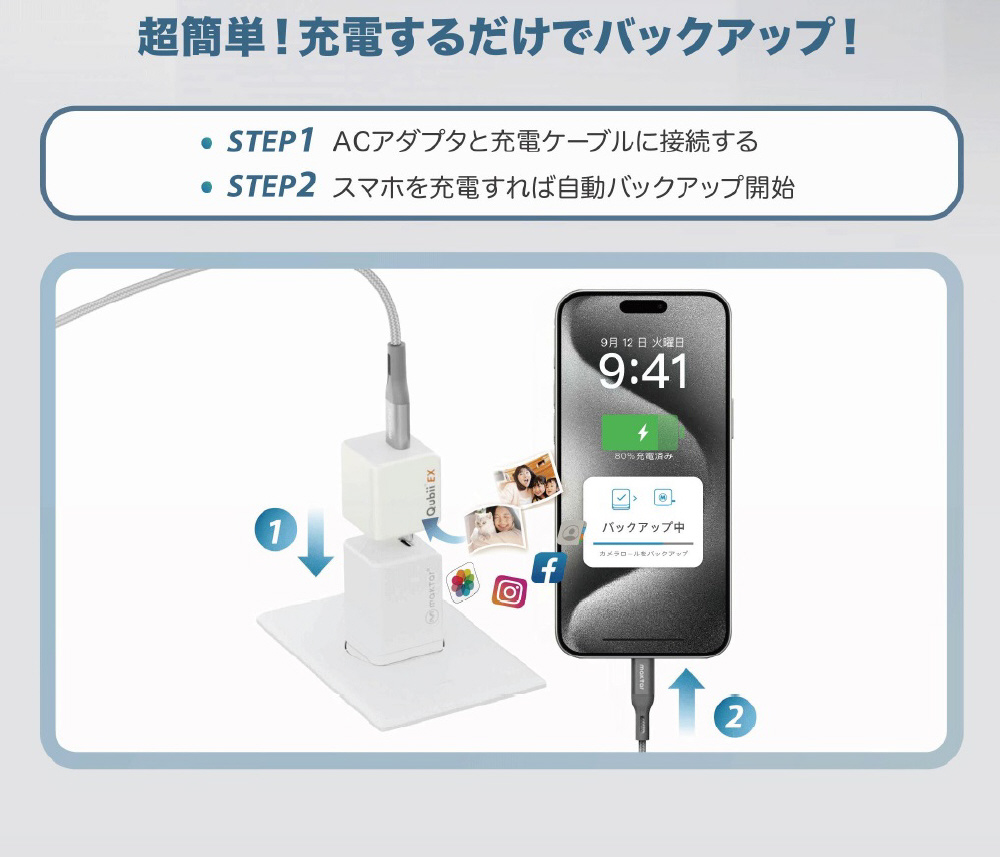 ネット接続不要、スマートフォンを充電するだけで自動的にバックアップも完了します。