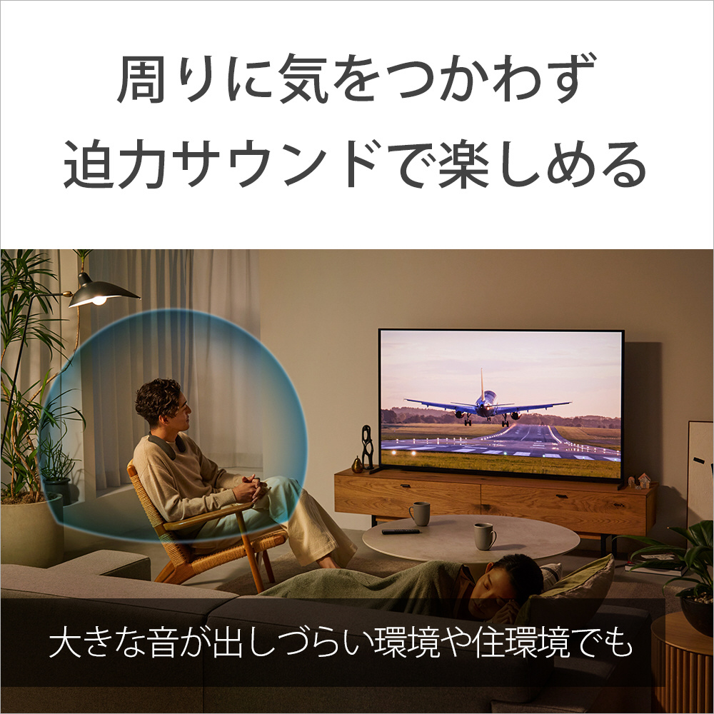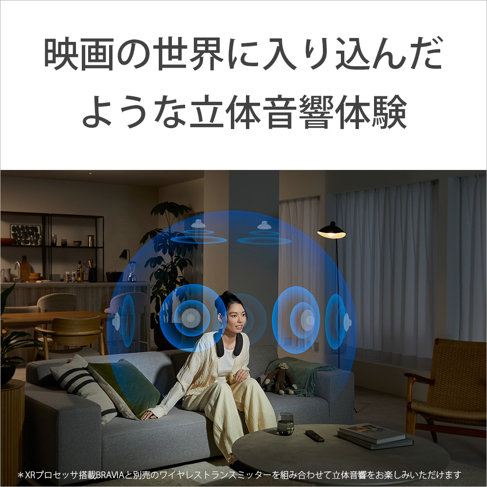 XRプロセッサ搭載BRAVIAと別売のワイヤレストランスミッター(WLA-NS7)を接続しワイヤレスネックバンドスピーカーを接続することで、前後左右を中心とした従来のサラウンド音場に高さ方向の表現力を加えた、圧倒的な音の広がりをご堪能いただけます。360 Spatial Sound Personalizerにより、音場を一人一人に最適化することで、まるで映画の世界に入り込んだような臨場感あふれる「360立体音響」をお楽しみいただけます。テレビドラマや音楽番組などの2chコンテンツも臨場感と広がりのある立体音響でお楽しみいただけます。