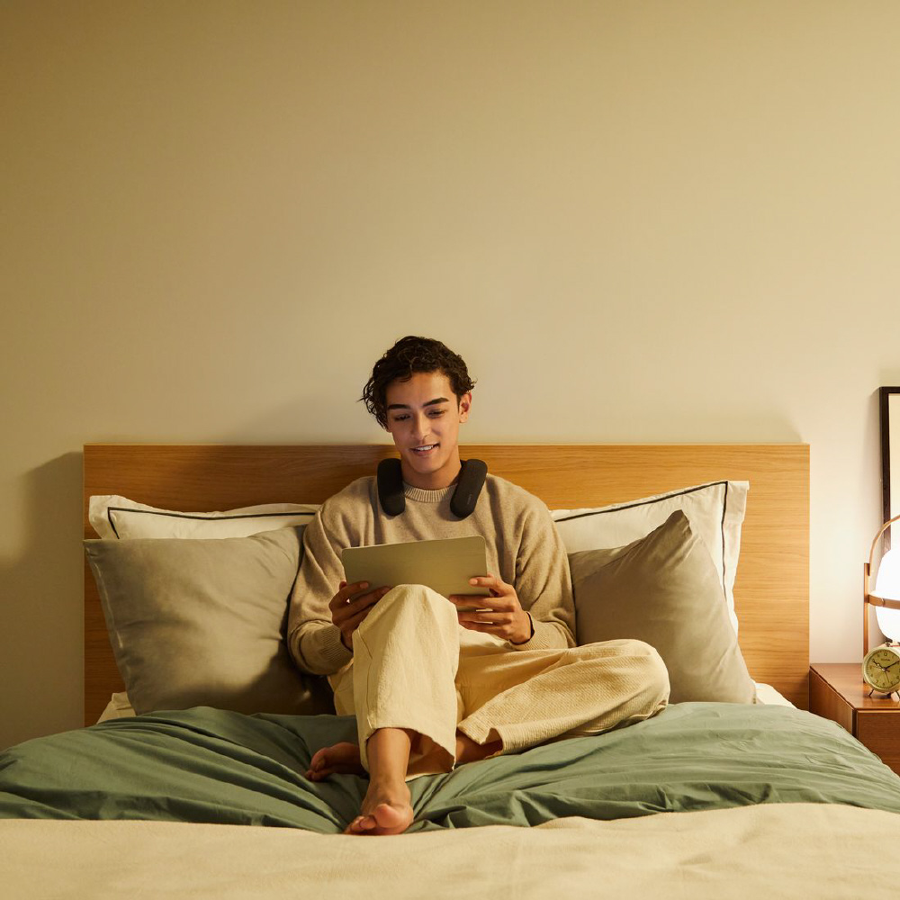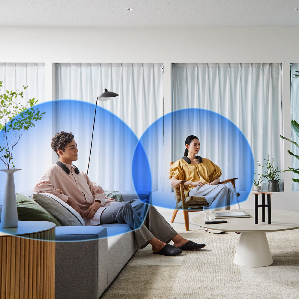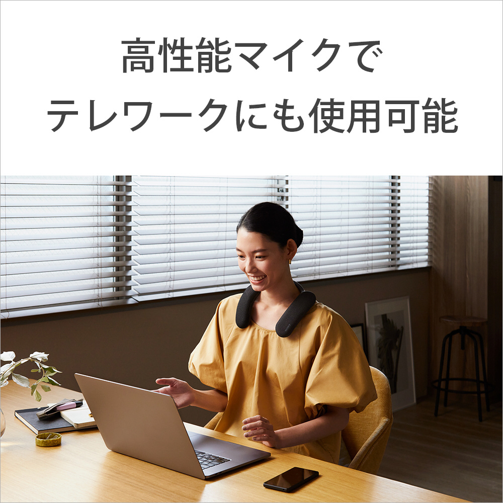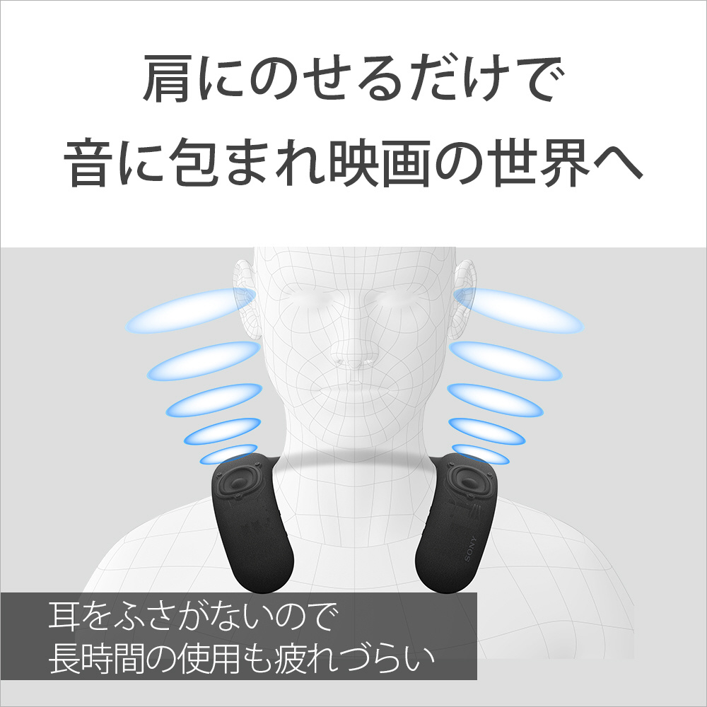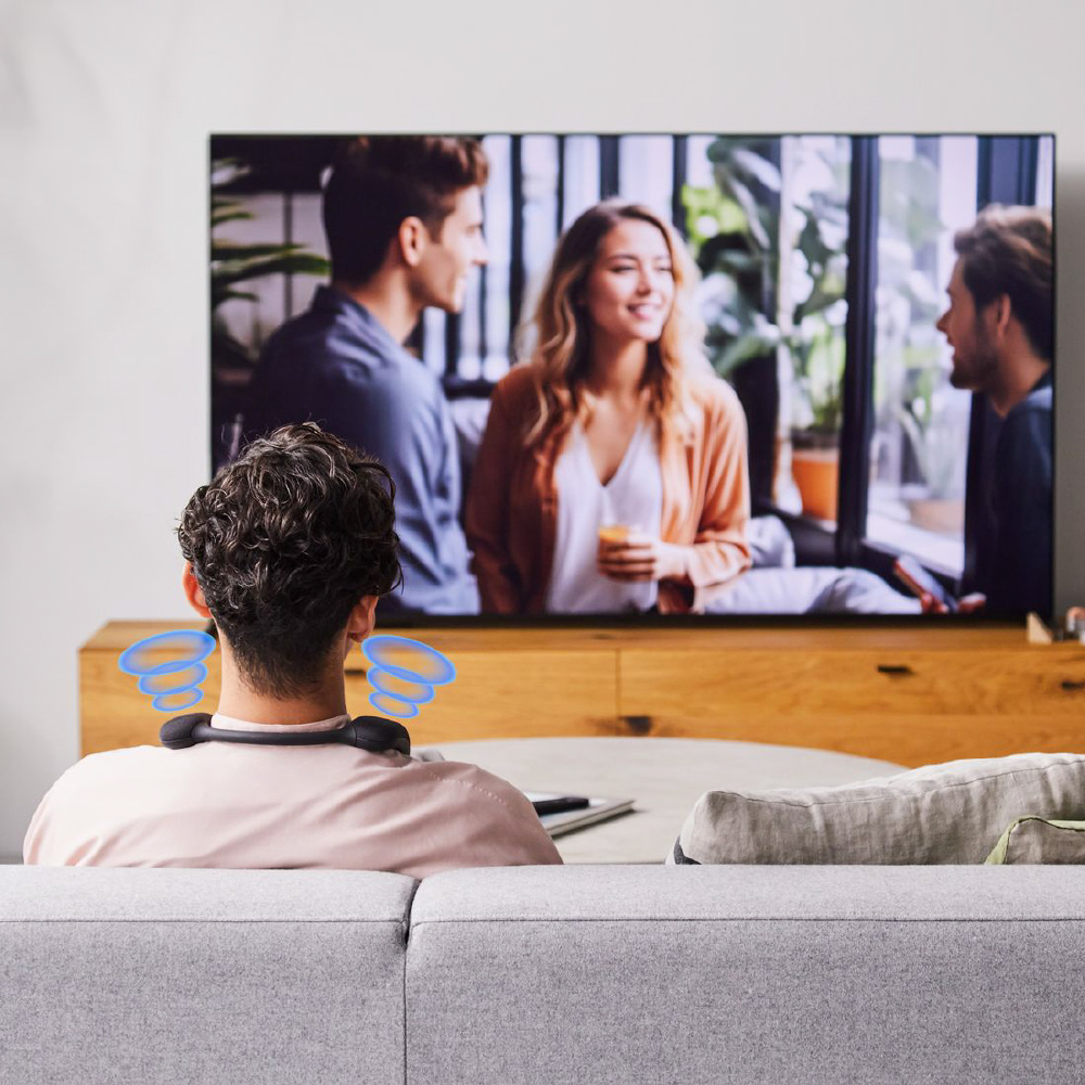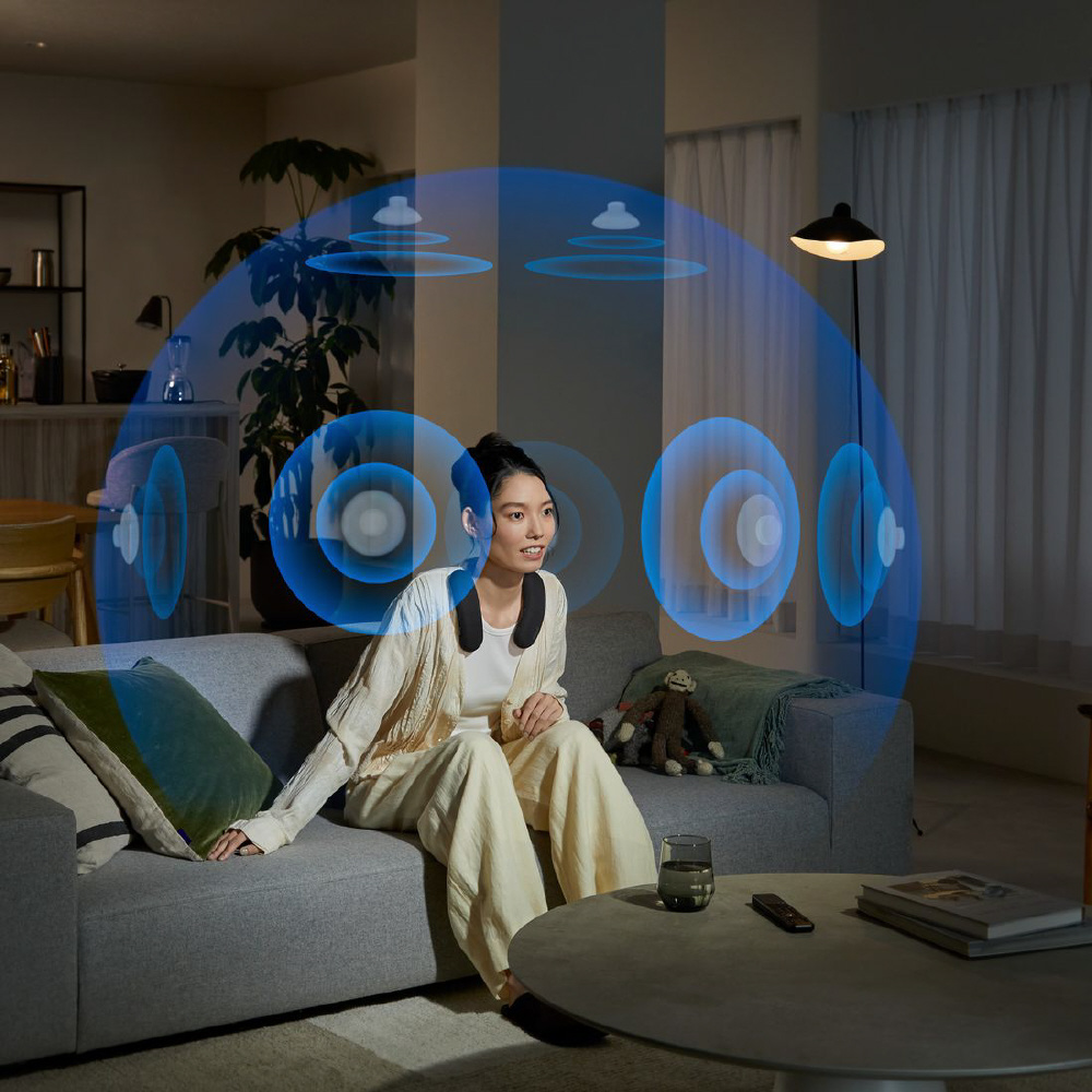 ネックスピーカーを肩にのせるだけの手軽さで、映画・ライブ映像の試聴時にまるでその場にいるような新たな視聴体験をもたらします。耳をふさがない形状なので長時間の動画視聴も快適です。耳元で音が広がるので隣家や周囲への配慮で大きな音を出しづらい環境でも、迫力のサウンドで楽しめます。