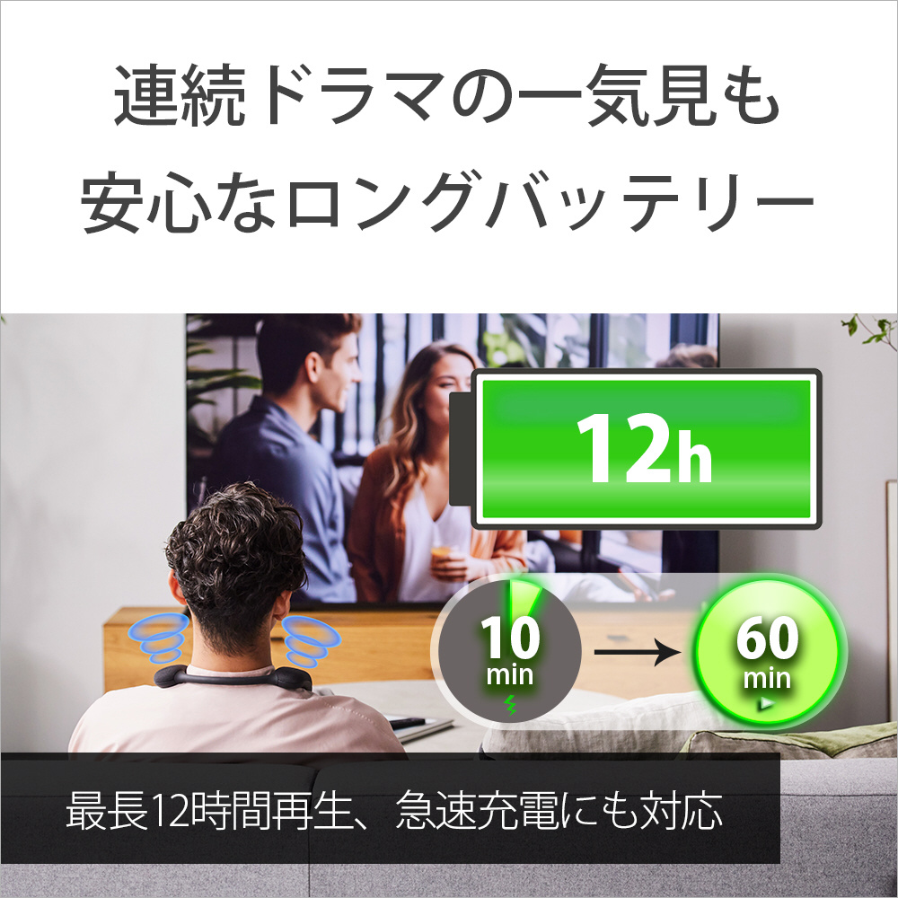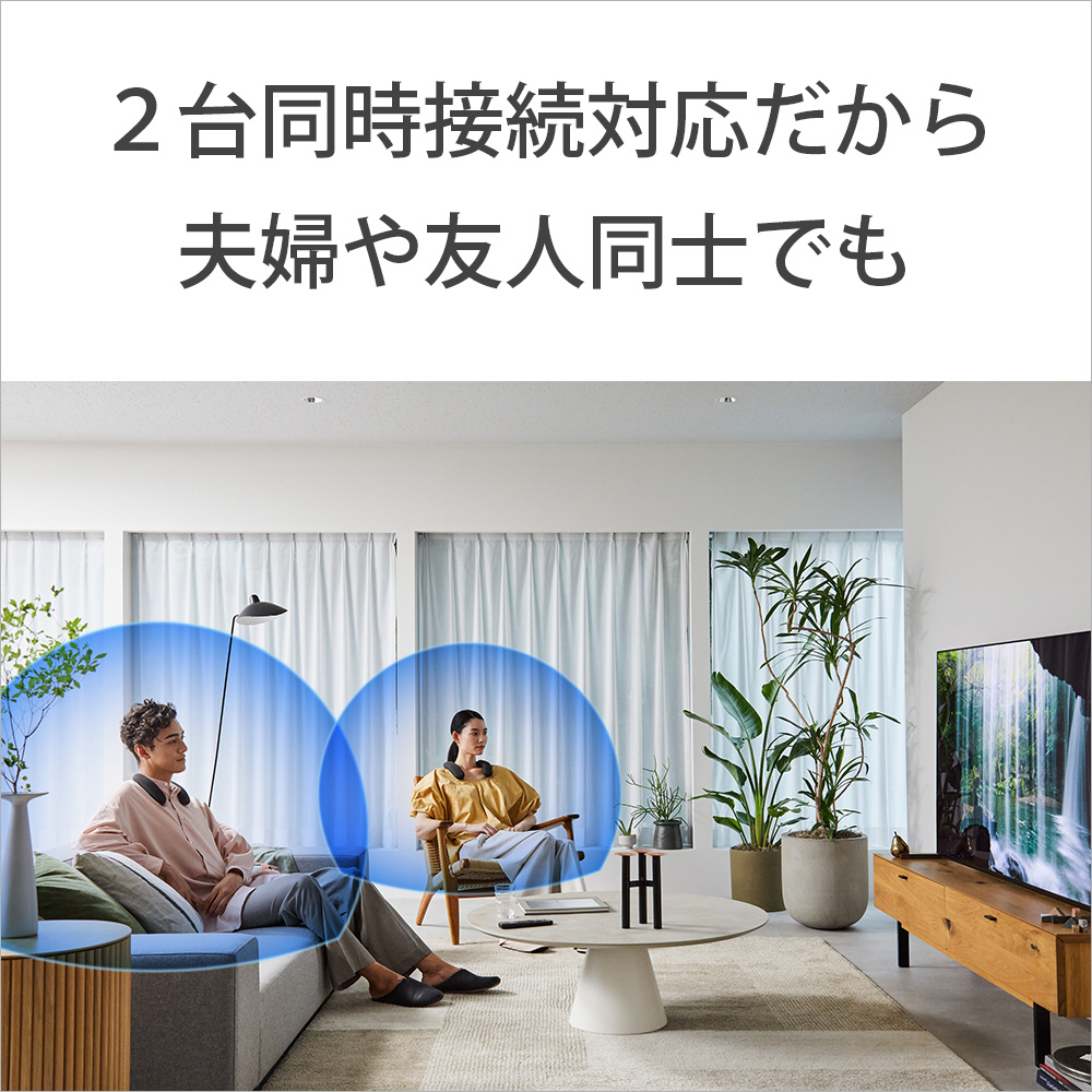アジャスタブルネックバンド機構を採用し、お客様の体形に合わせて使用いただけます。ネックバンド部は、形状記憶用の特殊素材が使われており、これにより、快適な装着性を実現しています。またコンパクトボディながら最長12時間再生のロングバッテリーで動画の一気見などでの長時間使用時も安心です。さらに2台まで同時接続可能。夫婦や友人同士で楽しめます。