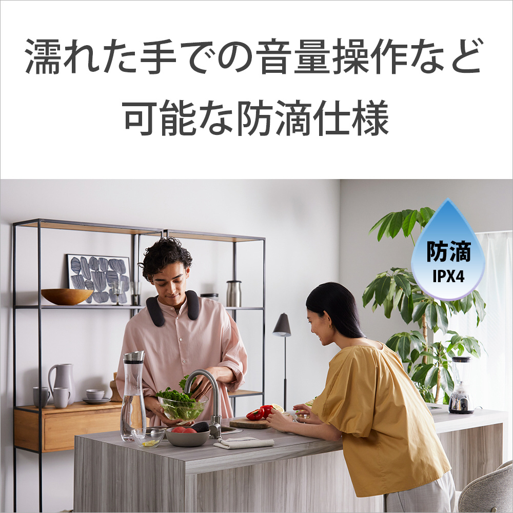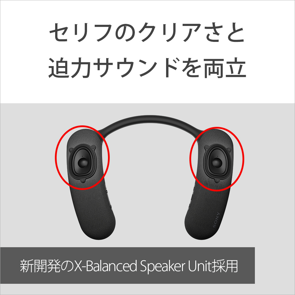 サウンドバーやワイヤレススピーカーでも搭載されている非対称形スピーカーユニット「X-Balanced Speaker Unit」を搭載しています。ネックバンドスピーカー本体はコンパクトなまま、スピーカーユニットの形状を工夫し有効振動板面積を最大化(※約1.5倍)することで、歪みの少ないクリアな音質を実現しています。