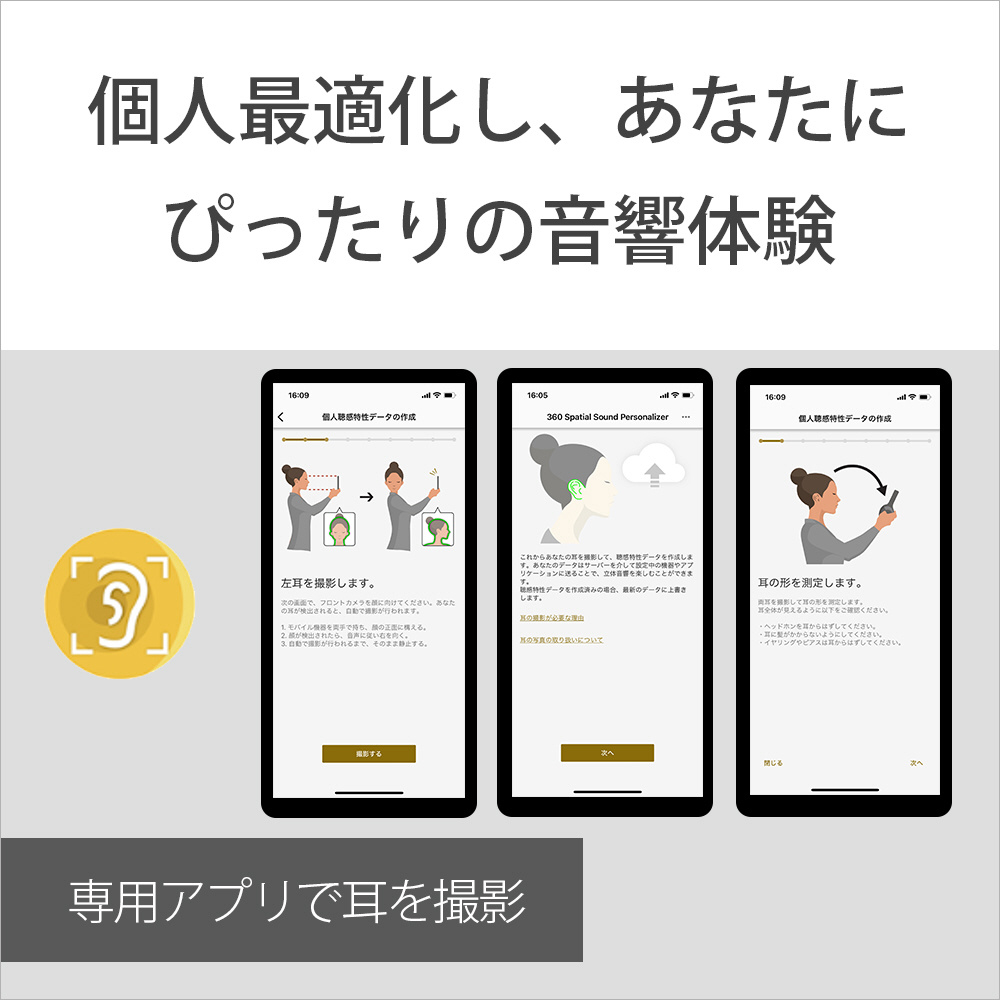 「360 Spatial Sound Personalizer」とはソニーがヘッドホンの立体音響コンテンツを再生する為に開発した独自の立体音響技術です。専用アプリ「Headphones Connect」や「360 Spatial Sound Personalizer」を使って撮影した耳の画像を、独自に開発した推定アルゴリズムにより個人の聴感特性を解析することで、音場を一人一人に最適化した、より臨場感ある体験を実現します。