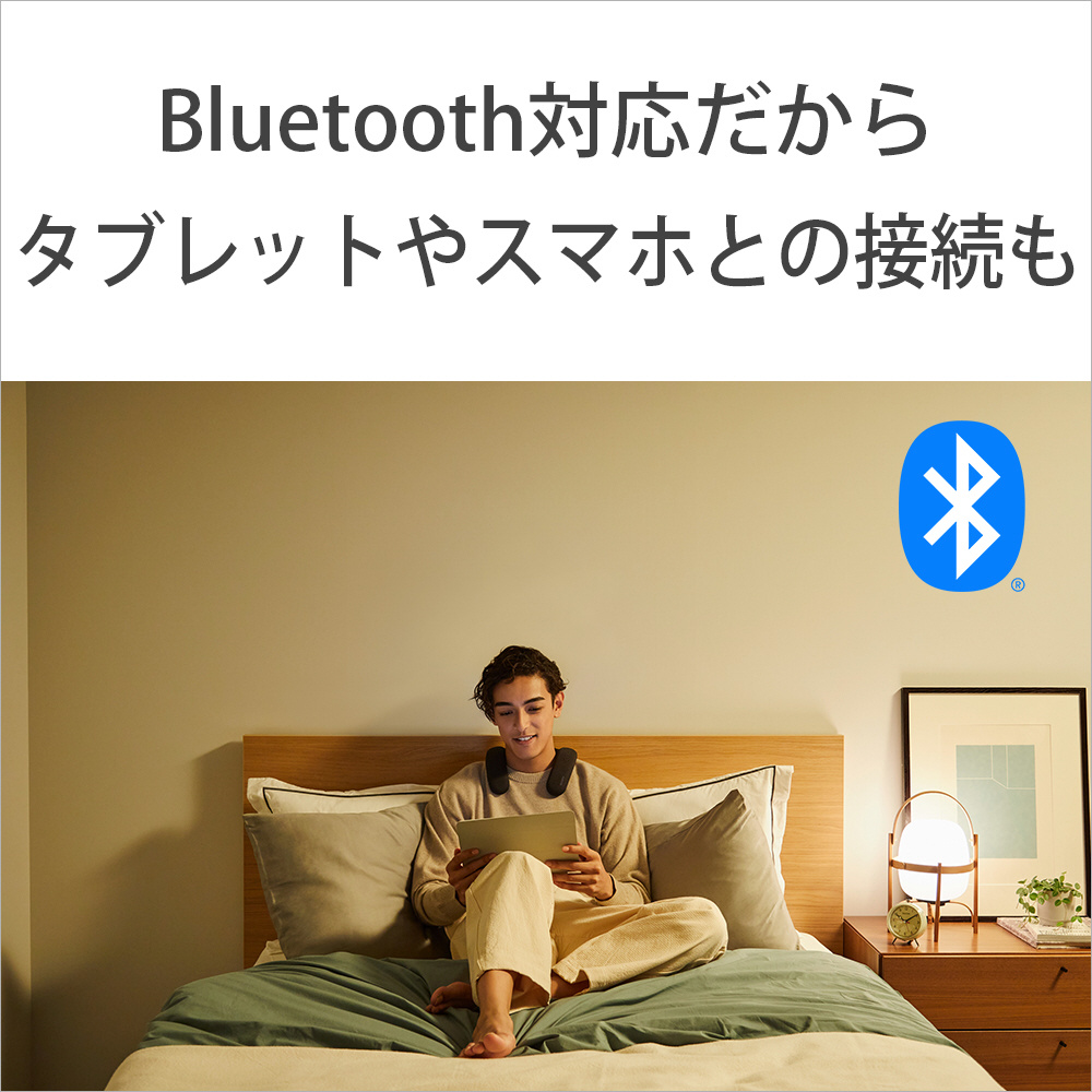 テレビの大画面での映画やライブ鑑賞だけではなく、Bluetooth®対応によりワイヤレスネックバンドスピーカー本体とスマートフォン、PC、ウォークマン®などのBluetooth®対応のオーディオ機器に保存された音楽や、ストリーミング再生をワイヤレスで楽しめます。