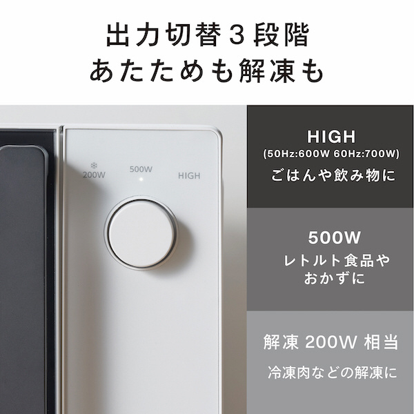 | レンジ出力 | あたためHIGH(50Hz:600W/60Hz:700W)/あたため500W/解凍200W相当 |